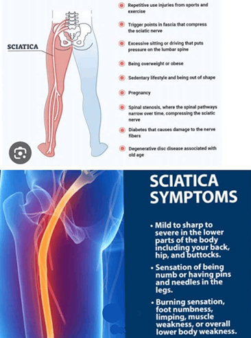 Sciatica causes sharp pain radiating from lower back to legs.